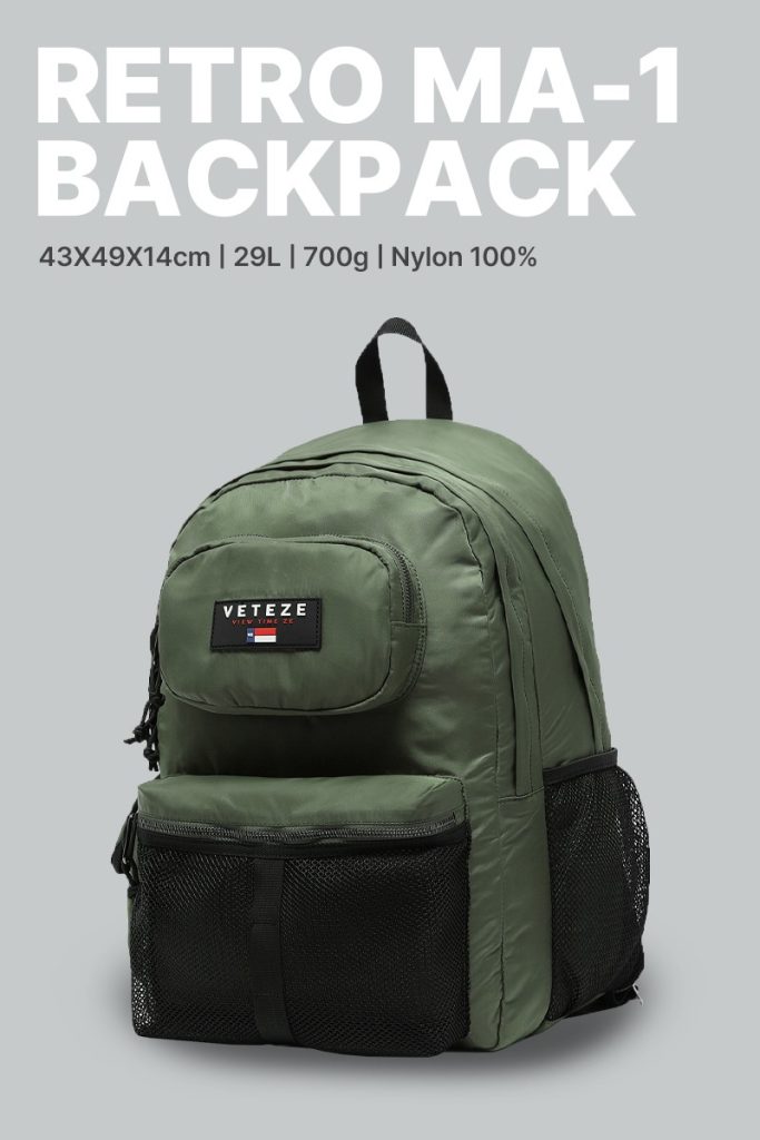 VETEZE復古MA-1後背包是參考了MA-1空軍飛行夾克所做出的特殊設計,同時保有復古運動包SEASON 1版本的標誌性。 內襯橘色車線鋪棉除了呈現MA-1飛行夾克的經典設計,同時也增加包包的厚度及緩衝能力,能夠保護放置包包內的物品。 附有多種收納夾層,可放置15吋筆記型電腦,機能性極佳。